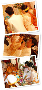 The monks are invited early in the morning. Usually for this part of the ceremony, only close family and friends might attend. The five precepts are first recited and then the monks chant auspicious text from the scriptures. While this is being done, some water in a bowl, with a candle dripping over it, is being made sacred. At the completion of the chanting, the wedding couple simultaneously, again representing their unity, offer food to each of the monks. After the monks have finished their meal, the couple then make another offering of flowers, money in an envelope and essential items for every day life for the monks. Any merit made during this ceremony is then passed onto ancestors and absent relatives by doing “kruat nam”, where water is poured from a container slowly into a bowl. The head monk will then mark the foreheads of the couple with three dots using paste which was blessed during the ceremony. He then blesses the couple with the holy water.